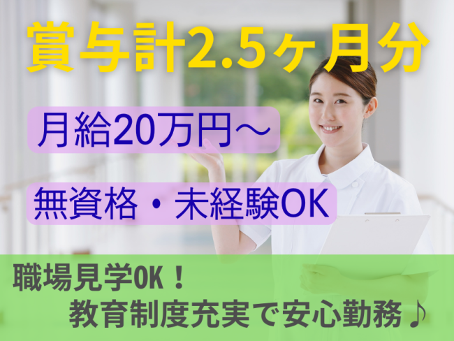 昇給あり月給20万円以上可能未経験歓迎残業月10時間以下無資格歓迎産休・育児休業制度あり資格手当あり賞与あり(年2回以上)車・バイク通勤OK 募集要項