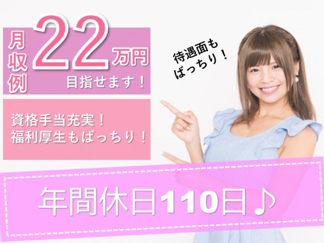 | 職種 | 特別養護老人ホームでの介護職員/月収例22万円/年間休日110日 |