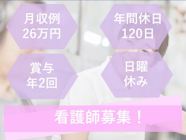 | 職種 | デイサービスでの看護職/月収例26万円/日曜休み |