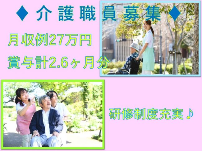 | 職種 | グループホームでの介護職/月収例27万円/賞与計2.6ヵ月分 |