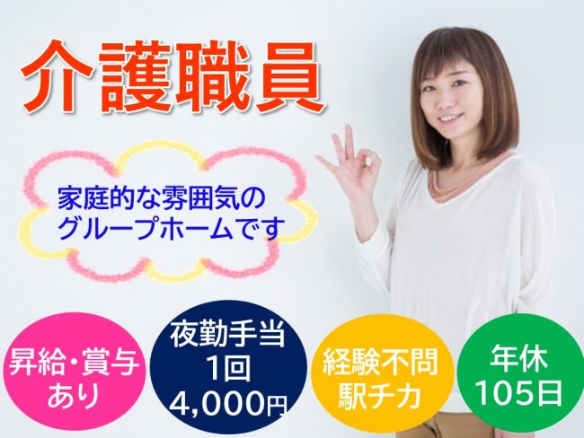 | 職種 | グループホームでの介護職員/賞与年2回/未経験可 |