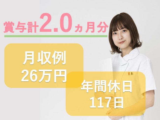 | 職種 | 介護付有料老人ホームでの看護職/月収例26万円/賞与計2.0ヵ月 |
