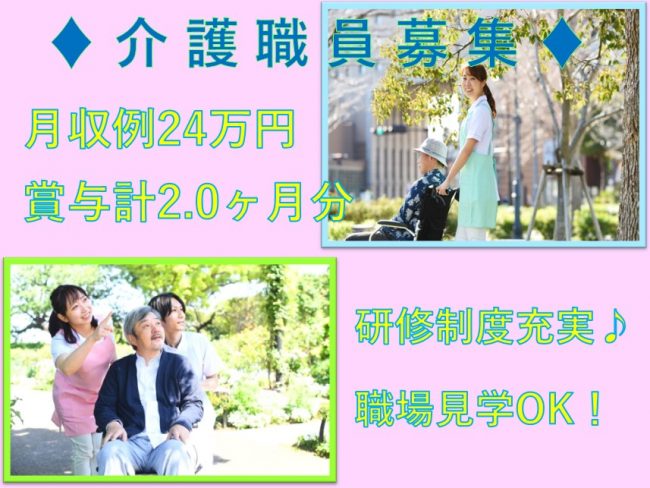 | 職種 | 小規模多機能での介護職/月収例24万円/賞与計2.0ヵ月分 |