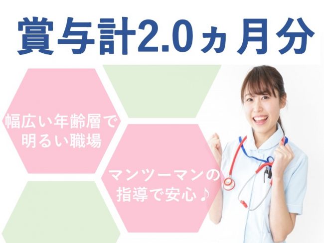 | 職種 | ケアハウスでの看護職/月収例21万円/賞与計2.0ヵ月分 |