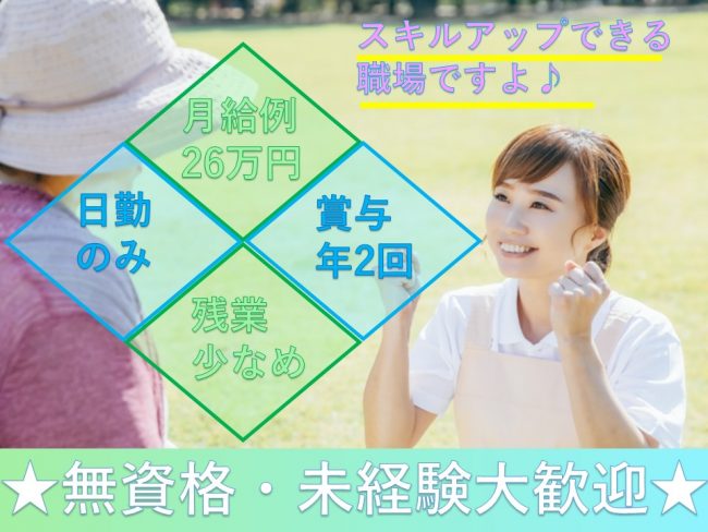 | 職種 | デイサービスでの介護職員/月収例26万円/残業少なめ |