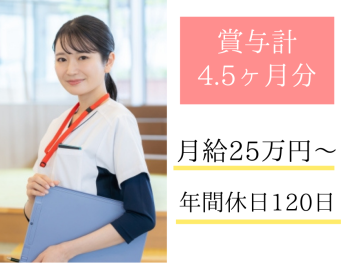 | 職種 | 特別養護老人ホームでの機能訓練指導員/月収例25万円/賞与計3.0ヵ月分 |