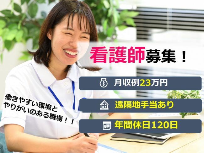 | 職種 | 特別養護老人ホームでの看護職/月収例23万円/年間休日120日 |