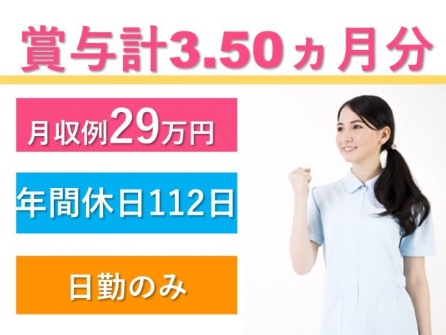| 職種 | 特別養護老人ホームでの看護師/月収例29万円/賞与計3.50ヵ月分 |