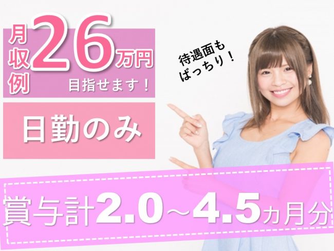 | 職種 | 介護老人福祉施設での看護師/月収例26万円/賞与計2.0ヶ月分~4.5ヵ月分/日勤のみ |