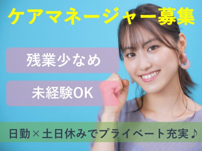 | 職種 | 居宅介護支援事業所でのケアマネージャー/土日休み/未経験OK |
