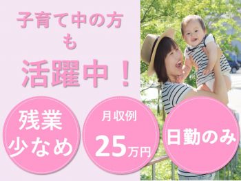 ■時間外月平均5時間年間休日110日以上施設見学OK日勤のみ昇給あり月給20万円以上可能未経験歓迎残業月10時間以下無資格歓迎産休・育児休業制度あり賞与あり(年2回以上)車・バイク通勤OK★月収例26万円 ★賞与あり ★年間休日110日 ★残業少なめ ★育児休業取得実績あり &...もっと見る -